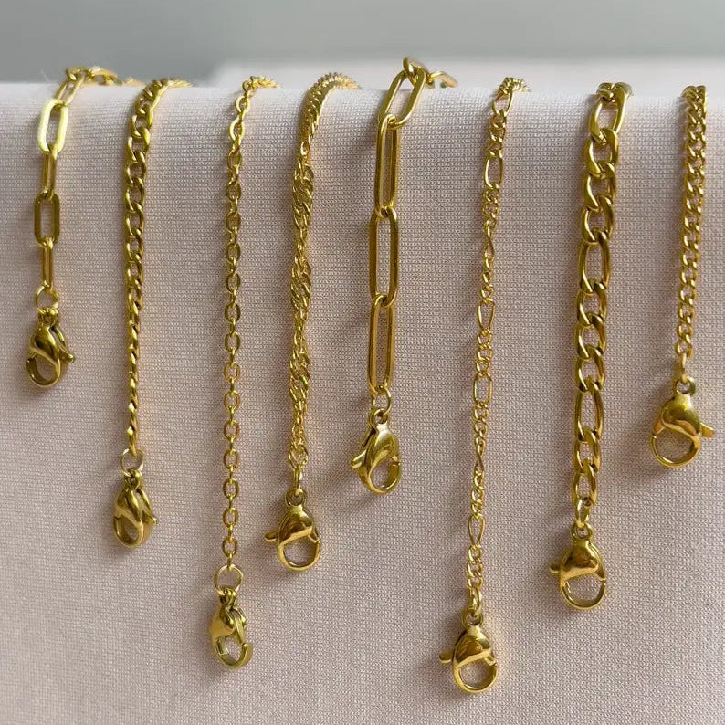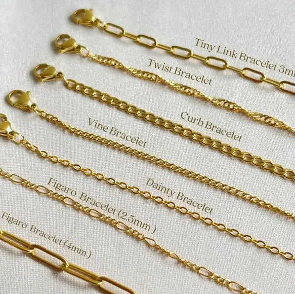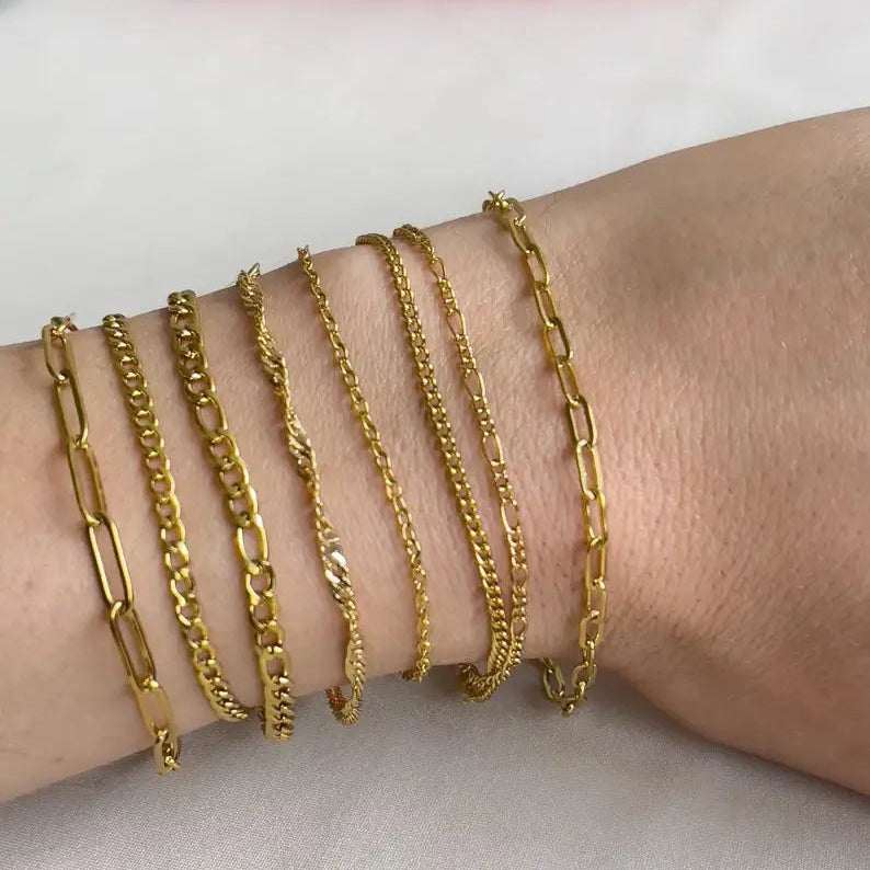 Our handcrafted Gold Chain Bracelets are designed for effortless elegance, made from premium 18K gold-filled and plated materials that are waterproof, non-tarnish, and hypoallergenic. Whether you're stacking multiple styles or wearing one solo, these dainty yet durable bracelets add timeless charm to your jewelry collection.