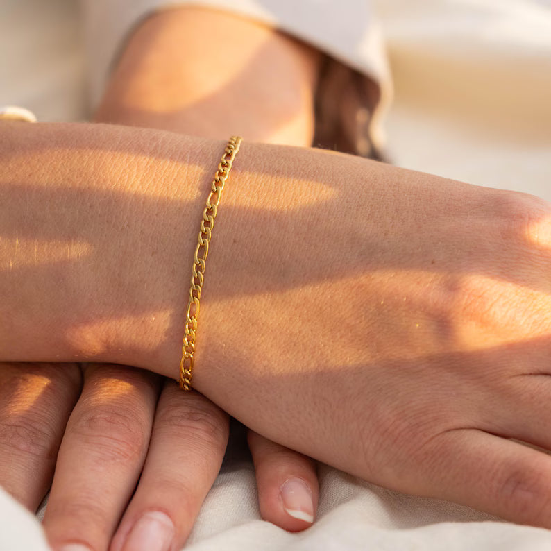 Bold in simplicity and built to last, this 18K Gold Filled Figaro Chain Bracelet brings timeless elegance to your everyday. With its classic alternating link pattern and durable gold-filled finish, it’s designed to never fade—no matter how often you wear it.